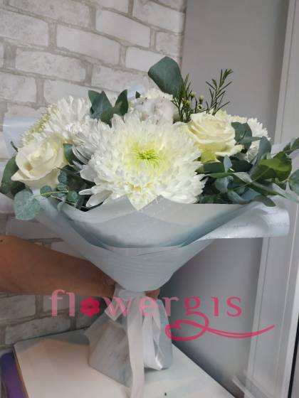 Данный букет будет превосходным подарком дорогому вам человеку, так как эта композиция в составе белых Роз и белых Хризантем, принесет бурю эмоций, и солнечного настроения на весь день.